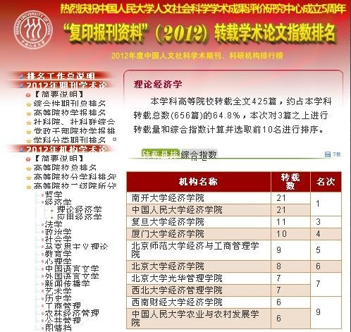 3月26日,2012年度“人大复印报刊资料”转载学术论文指数排名及相关分析报告正式发布。我院在高等院校二级院所“理论经济学”学科转载排名中取得了转载量第7名、综合指数第8名的好成绩。转载量和综合指数排名比2011年度各上升2位。这一排名充分说明我院在理论经济学研究方面具有明显优势,在近年来更是取得了长足的进步。