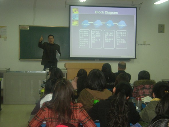 第二个出场的是三人行,她们同样以《谭木匠的差异化战略及其启示》为题,介绍了谭木匠的差异化战略,但其所选取的具体分析角度和使用的具体分析方法又有别于上一个团队,她们选用的是五力模型,从五个方面介绍了谭木匠差异化战略的成功之处,尤其是刘思思同学精彩的讲解得到了老师和同学的一致认可。