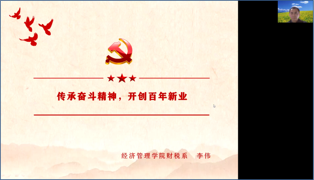 为进一步推进三全育人工作,形成思想政治教育的生动局面,3月19日,财政与税收系党支部书记李伟通过腾讯会议为财政与税收系本科生做了题目为《传承奋斗精神,开创百年新业》的专题讲座,系统学习了十九届六中全会精神,受到了学生的欢迎。