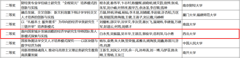白永秀教授团队长期深耕马克思主义城乡发展理论与中国实践,研究的成果“面向国家城乡发展战略的经济学研究生导师团队育人新模式探索与实践”,遵循研究生成长规律和导学相长规律,提出了针对研究生培养的导师团队合作育人理念,由过去“研究生—导师”双元互动转化为“研究生—导师团队—联动平台”多元互动,不断拓展学生成长成才的边界和路径,成果实施十余年来,培养出了众多适应国家战略需求和地方经济社会发展需要的高层次经济学人才。该成果此前曾荣获陕西省研究生教育成果特等奖及陕西省教学成果一等奖。